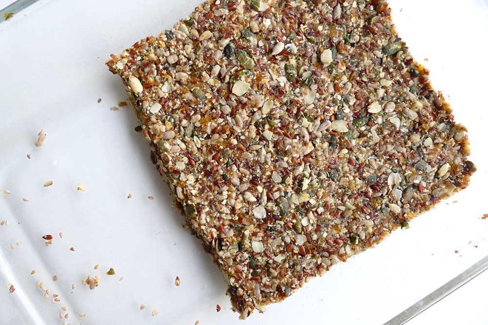 Pak een ovenschaal (of andere schaal) en druk hierin het mengsel plat (zie foto’s hieronder). Dit kan met een lepel of gewoon met je handen. Vorm het in een rechthoek of vierkant, zo’n 2 á 3 cm hoog. Als laatste druk je de sesamzaadjes in de reep.